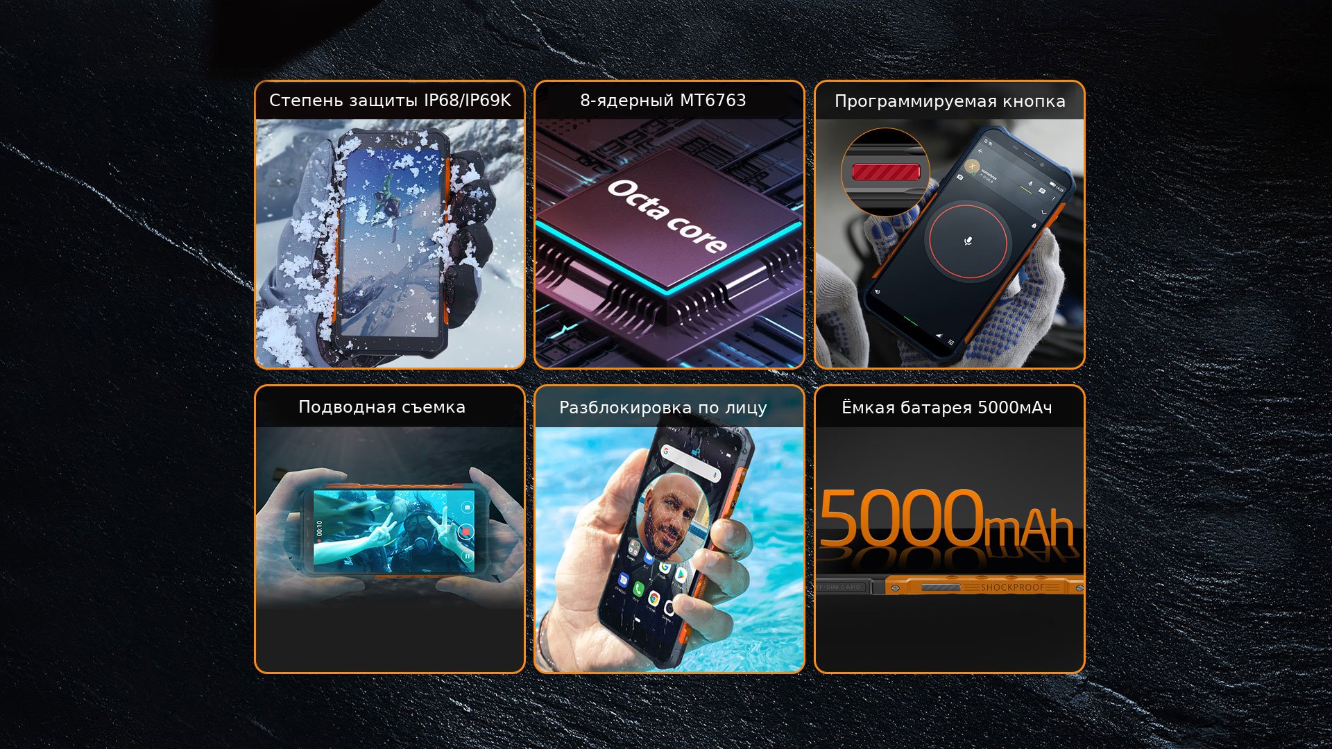 Соответствие высочайшим стандартам защиты IP68/IP69K, позволяет смартфону находиться на глубине до 1.5м в течение 30 минут, может быть погружен в бетонный раствор на 24 часа на глубину до 1м и выдерживает падения с высоты до 1.2м. Смартфон прошёл испытание температурой, влажностью, соляным туманов, природным газом, тест вблизи оружия в момент выстрела и другие тесты. Будьте уверены, Ulefone Armor X5 Вас не подведёт.