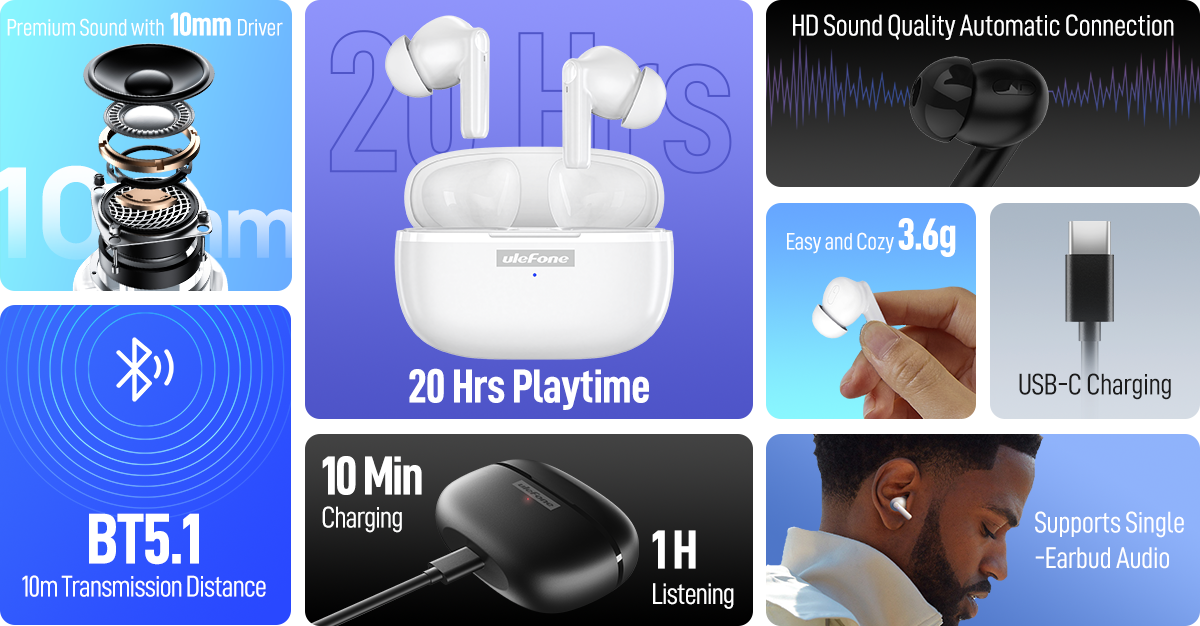 Наушники Ulefone Buds обеспечивают отличный звук, несмотря на такой низкий вес. 5 часов звучания без подзарядки и до 20 часов с учётом кейса.