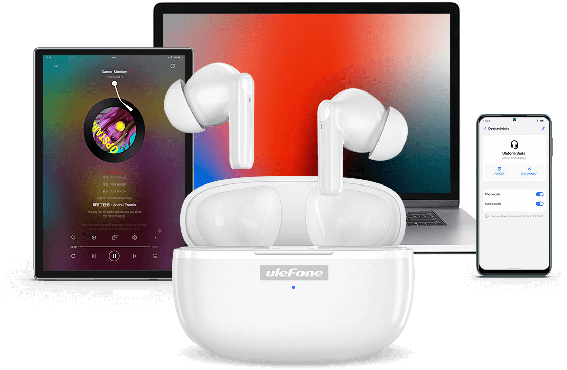 В наушниках Ulefone Buds отсутствуют провода, они работают по беспроводной технологии BlueTooth 5.1. Отсутствует задержка в играх, звонках и при просмотре видео, дальность работы до 10м.