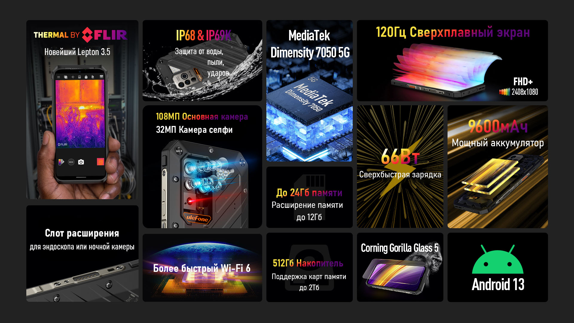Предыдущие характеристики являются теоретическими значениями, основанными на конструкции продукта. Некоторые функции и технические характеристики могут различаться в зависимости от рынка. Для предоставления точной информации о продукте, технических характеристик и функций Ulefone может в режиме реального времени вносить коррективы в предыдущие спецификации, чтобы они соответствовали производительности продукта, спецификациям, индексам и компонентам фактического продукта. Информация о продукте может быть изменена и дополнена без предварительного уведомления.